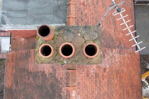 The chimney crown is the concrete or cement layer sealing the top of the stack, protecting the bricks and flue from direct exposure to the elements. Cracks in the crown will allow rainwater to slowly seep in, travelling down the chimney and into the roof structure. Early signs of this issue include damp patches on ceilings or visible cracks at the top of the chimney. Repairing or resealing the crown with a waterproof coating will prevent any further damage.